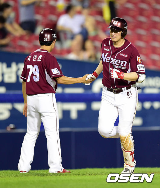 8회초 1사에서 넥센 유한준이 좌월 솔로 홈런을 날리고 최만호 코치와 하이파이브를 하고 있다.