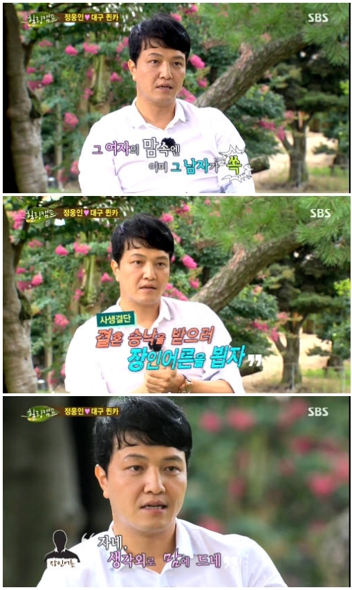 이날 정웅인은 친구의 결혼식에서 처음 만난 아내와 결혼에 이르기까지의 이야기를 털어놨다. 처음에는 대구에서 온 촌스러운 대학생이란 느낌을 받았던 아내였지만, 두 번째 만났을 때는 운명이라고 생각했다고.