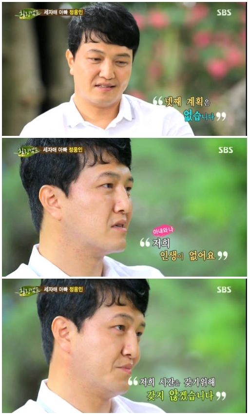 세 아이의 아빠인 정웅인은 "아내에게 참 고맙다. 스물셋에 시집와서 7년 간 딸을 셋 출산했다"며 고마움을 드러냈다. 그는 "나이가 있어서 빨리 아이를 갖고 싶었다. 어쩌다 둘째를 갖게 됐다. 종손의 부담감에 아들이 있어야 겠단 마음이 들었다. 아내에게 셋째 아들을 낳고 효도하자"고 말했다.