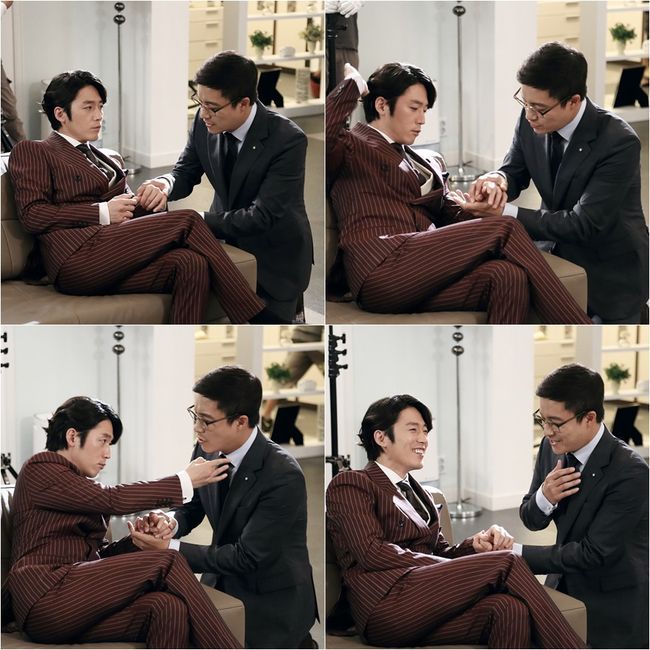 5일 공개된 사진 속 장혁은 허세작렬 사장 역할답게 말끔한 수트를 차려 입고, 다리를 꼰 채 소파에 기대 앉아 있다. 반면 탁실장 역할의 최대철은 평소 촐싹 맞은 캐릭터답게 두 손으로 장혁의 손을 감싸 쥔 채 공손하게 무릎을 꿇고 앉아 있어 눈길을 끈다.