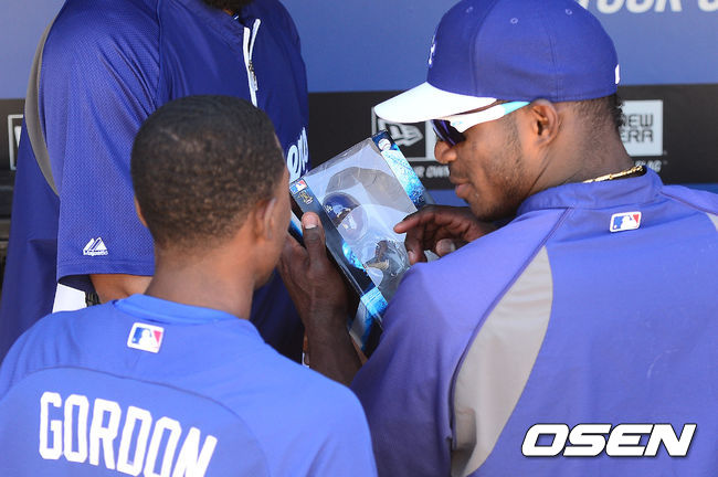 5일(한국시간) 미국 캘리포니아주 로스앤젤레스 다저스타디움에서 열리는 '2014 메이저리그' LA 다저스와 LA 에인절스의 경기에 앞서 다저스 디 고든이 자신의 버블헤드의 관심을 보이는 푸이그와 이야기를 나누고 있다.