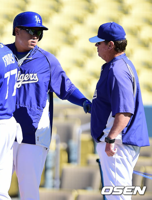 5일(한국시간) 미국 캘리포니아주 로스앤젤레스 다저스타디움에서 열리는 '2014 메이저리그' LA 다저스와 LA 에인절스의 경기에 앞서 다저스 류현진이 허니컷 코치에게 장난을 치고 있다.