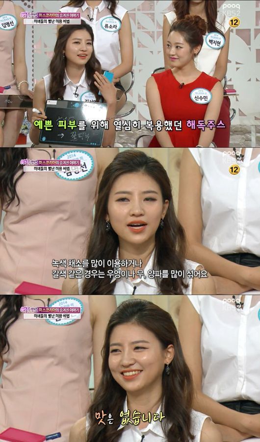 2014 미스코리아 진 김서연이 아름다운 민낯을 위해 해독주스를 마신다고 밝혔다.