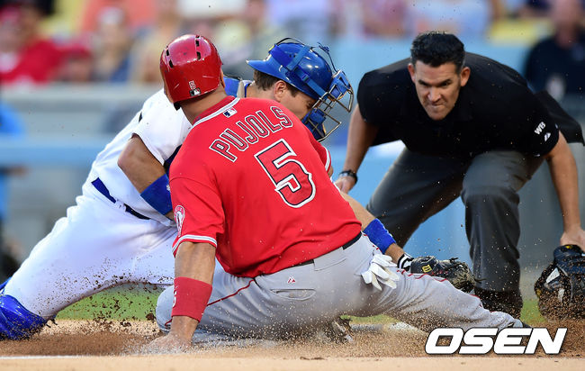 1회초 1사 3루 에인절스 푸홀스가 아이바의 1루 앞 땅볼때 홈으로 쇄도하다 아웃당하고 있다.