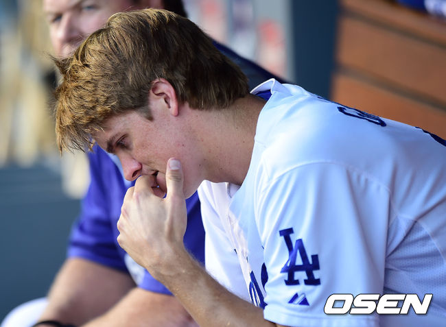1회초 수비를 마친 다저스 그레인키가 더그아웃에 앉아 아쉬워하고 있다.