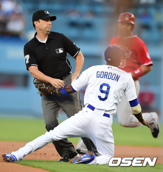 1회초 무사 2루 에인절스 푸홀스의 중전 안타때 다저스 푸이그의 송구를 잡으려던 디 고든이 2루심과 충돌해 넘어지고 있다.
