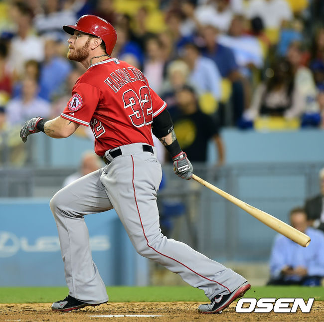 6회초 에인절스 해밀턴이 솔로 홈런을 때리고 있다.