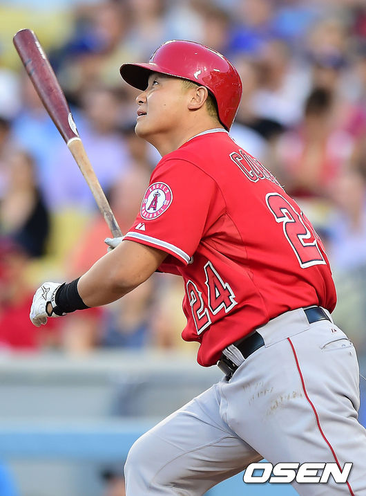에인절스 최현이 타격을 한 뒤 타구를 바라보고 있다.