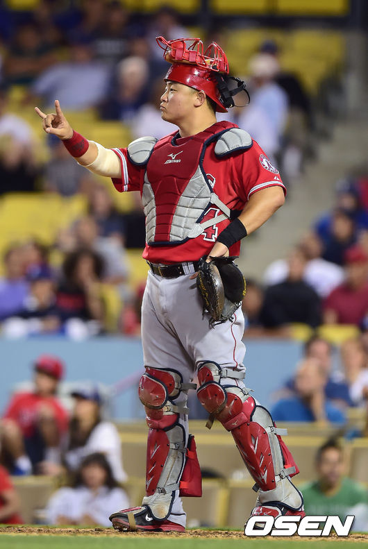 에인절스 최현이 야수들에게 사인을 보내고 있다.