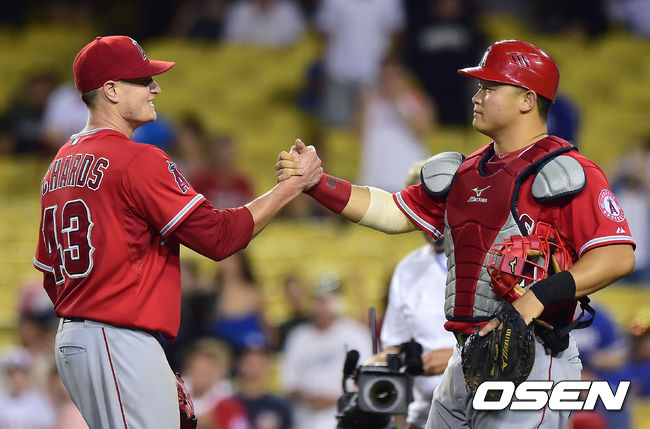 완봉승을 거둔 에인절스 리처즈와 최현이 악수를 나누고 있다./youngrae@osen.co.kr