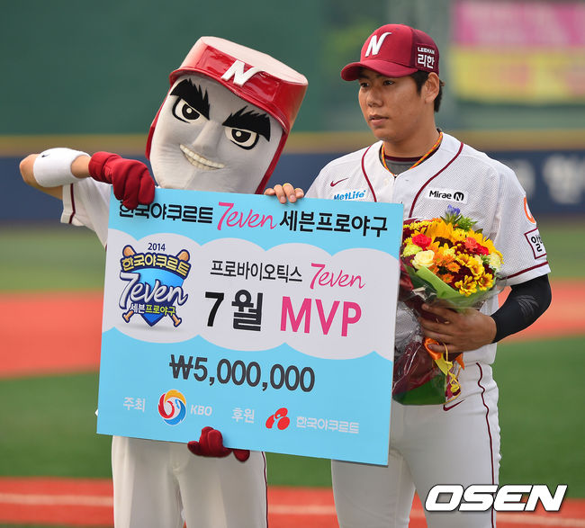 5일 오후 목동 야구장에서 열린 '2014 한국야쿠르트 세븐 프로야구' 넥센 히어로즈와 SK 와이번스의 경기, 경기 전 넥센 강정호가 7월 MVP에 선정되고 있다.