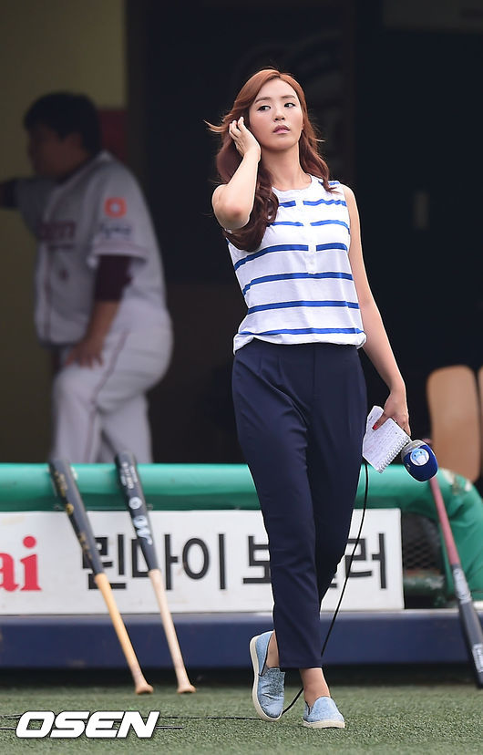 5일 오후 목동 야구장에서 열린 '2014 한국야쿠르트 세븐 프로야구' 넥센 히어로즈와 SK 와이번스의 경기, 경기 전 KBSN 정인영 아나운서가 인터뷰를 기다리며 땀을 닦고 있다.