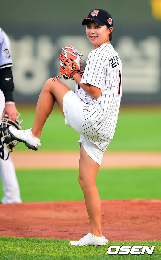 5일 오후 부산 사직구장에서 열린 '2014 한국야쿠르트 세븐 프로야구' 롯데 자이언츠와 NC 다이노스의 경기전 여자골퍼 김효주가 시구를 하고 있다.