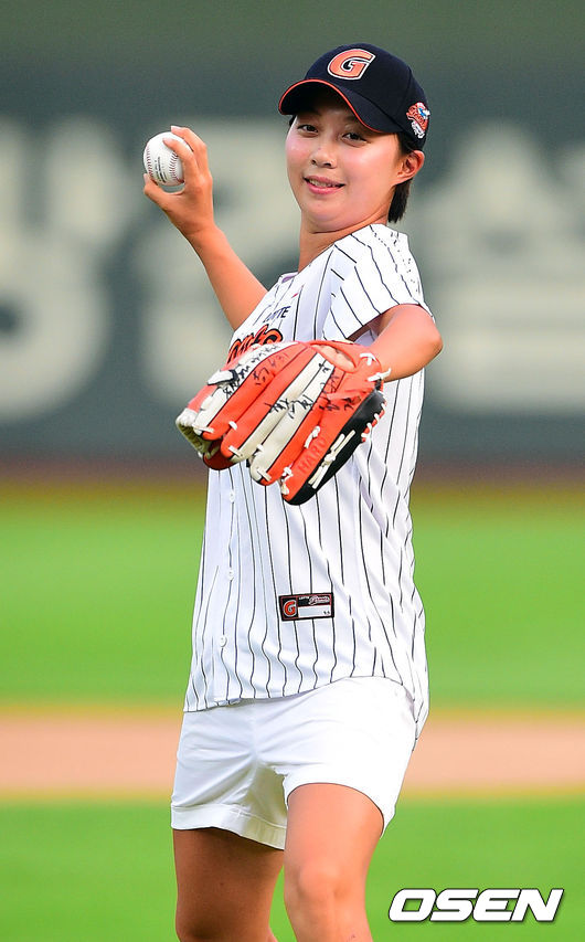 5일 오후 부산 사직구장에서 열린 '2014 한국야쿠르트 세븐 프로야구' 롯데 자이언츠와 NC 다이노스의 경기전 여자골퍼 김효주가 시구를 하고 있다.