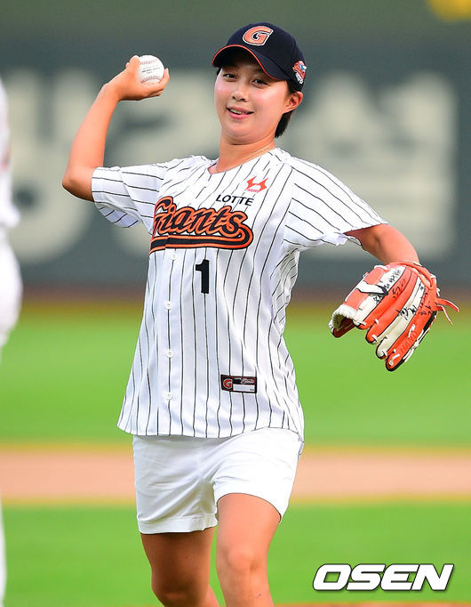 5일 오후 부산 사직구장에서 열린 '2014 한국야쿠르트 세븐 프로야구' 롯데 자이언츠와 NC 다이노스의 경기전 여자골퍼 김효주가 시구를 하고 있다.