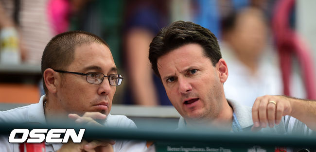 5일 오후 목동 야구장에서 열린 '2014 한국야쿠르트 세븐 프로야구' 넥센 히어로즈와 SK 와이번스의 경기, MLB(세인트루이스 카디널스)에서 온 스카우트들이 경기를 주시하고 있다.