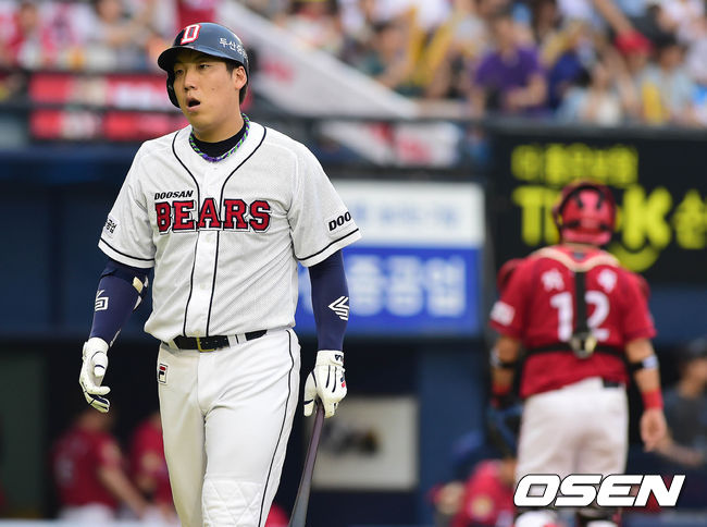 5일 오후 서울 잠실구장에서 열린 '2014 한국야쿠르트 세븐 프로야구' 두산 베어스와 KIA 타이거즈의 경기 1회말 2사 김현수가 삼진을 당하고 덕아웃으로 향하고 있다.
