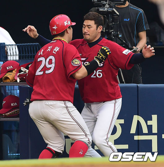 5일 오후 서울 잠실구장에서 열린 '2014 한국야쿠르트 세븐 프로야구' 두산 베어스와 KIA 타이거즈의 경기 2회초 선두타자 나지완이 솔로 홈런을 치고 서재응과 세리머니를 하고 있다.