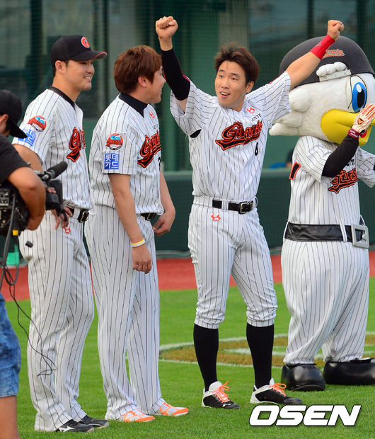 5일 오후 부산 사직구장에서 열린 '2014 한국야쿠르트 세븐 프로야구' 롯데 자이언츠와 NC 다이노스의 경기전 롯데 전준우가 김하늘과의 대결에서 승리후 환호하고 있다.