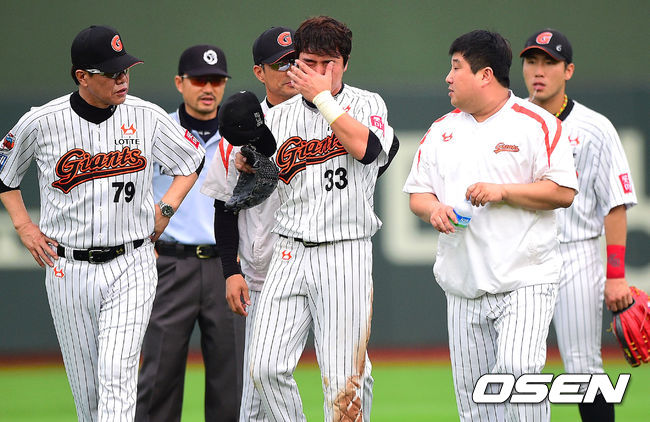 OSEN=부산,박준형 기자] 5일 오후 부산 사직구장에서 열린 '2014 한국야쿠르트 세븐 프로야구' 롯데 자이언츠와 NC 다이노스의 경기 2회초 롯데 정훈이 어지러움을 호소하고 있다.