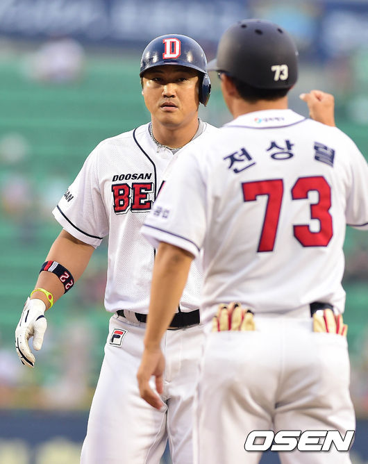 5일 오후 서울 잠실구장에서 열린 '2014 한국야쿠르트 세븐 프로야구' 두산 베어스와 KIA 타이거즈의 경기 2회말 무사 2루 홍성흔이 1타점 적시타를 치고 전상렬 코치와 하이파이브를 하고 있다.