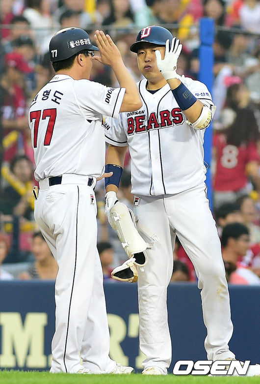5일 오후 서울 잠실구장에서 열린 '2014 한국야쿠르트 세븐 프로야구' 두산 베어스와 KIA 타이거즈의 경기 2회말 무사 1루 양의지가 1타점 3루타를 치고 전형도 코치와 하이파이브를 하고 있다.