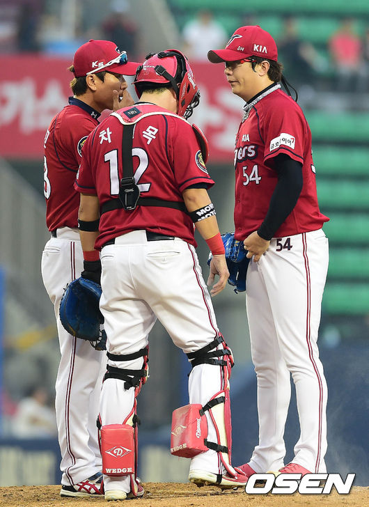 5일 오후 서울 잠실구장에서 열린 '2014 한국야쿠르트 세븐 프로야구' 두산 베어스와 KIA 타이거즈의 경기 2회말 무사 1루 양의지에게 1타점 3루타를 허용한 양현종이 이대진 코치와 이야기를 나누고 있다.