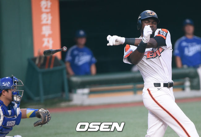 5일 오후 청주 야구장에서 열린 '2014 한국야쿠르트 세븐 프로야구' 한화 이글스와 삼성 라이온즈 경기, 2회말 무사 1루 피에 헛스윙을 하며 배트를 놓치고 있다.