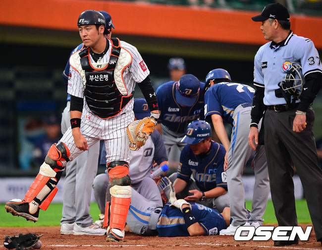 5일 오후 부산 사직구장에서 열린 '2014 한국야쿠르트 세븐 프로야구' 롯데 자이언츠와 NC 다이노스의 경기 3회초 1사 2,3루 NC 김종호의 내야땅볼때 3루 주자 손시헌이 홈에서 세이프됐다. 롯데 강민호 포수가 세이프 판정에 수긍하고 있다