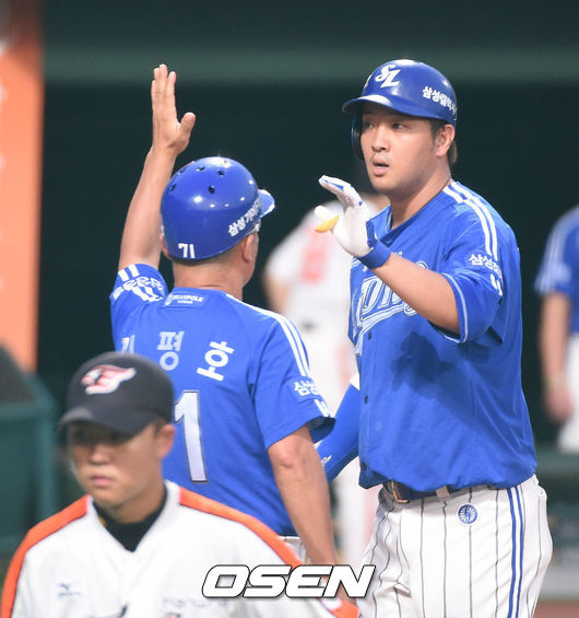 5일 오후 청주 야구장에서 열린 '2014 한국야쿠르트 세븐 프로야구' 한화 이글스와 삼성 라이온즈 경기, 3회초 1사 2루 채태인 투런 홈런을 날리고 홈인 김평호 코치의 환영을 받고 있다.