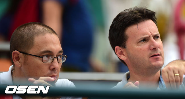 5일 오후 목동 야구장에서 열린 '2014 한국야쿠르트 세븐 프로야구' 넥센 히어로즈와 SK 와이번스의 경기, MLB(세인트루이스 카디널스)에서 온 스카우트들이 경기를 주시하고 있다.