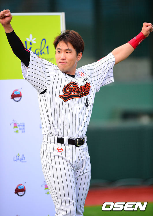 OSEN=부산,박준형 기자] 5일 오후 부산 사직구장에서 열린 '2014 한국야쿠르트 세븐 프로야구' 롯데 자이언츠와 NC 다이노스의 경기전 니어핀 대결에서 롯데 전준우가 골퍼 김하늘과 대결 승리후 환호하고 있다.