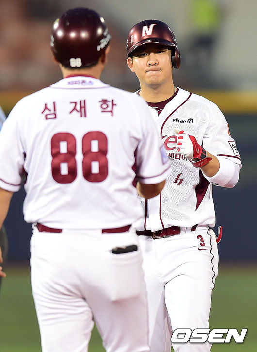 5일 오후 목동 야구장에서 열린 '2014 한국야쿠르트 세븐 프로야구' 넥센 히어로즈와 SK 와이번스의 경기, 4회말 2사 주자 1,2루 넥센 김민성이 우중간 선취 2타점 적시타를 날린 후 2루에서 심재학 코치와 하이파이브를 하고 있다.