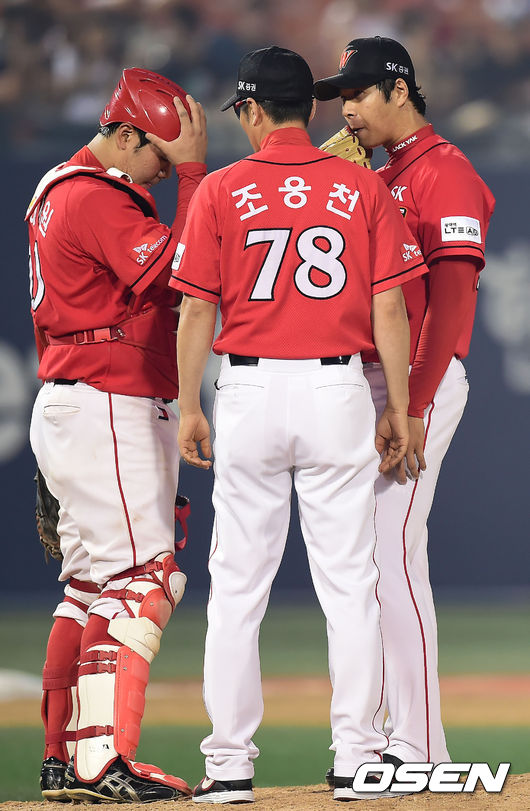 5일 오후 목동 야구장에서 열린 '2014 한국야쿠르트 세븐 프로야구' 넥센 히어로즈와 SK 와이번스의 경기, 4회말 2사 주자 1,3루 넥센 문우람 타석에서 SK 조웅천 코치가 마운드에 올라 선발 김대유에게 말을 걸고 있다.