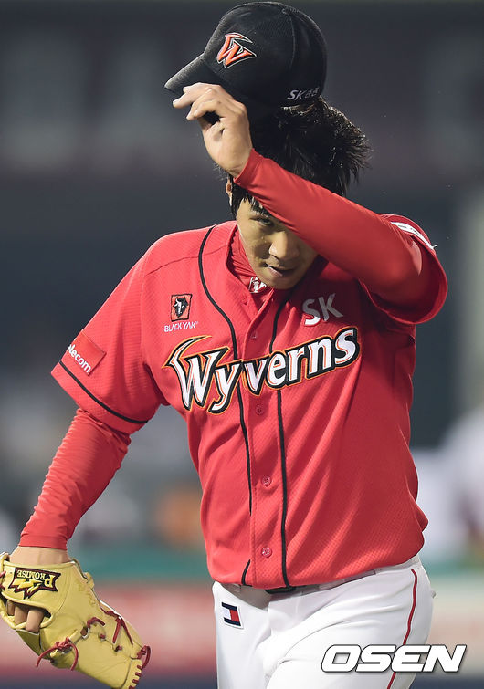 5일 오후 목동 야구장에서 열린 '2014 한국야쿠르트 세븐 프로야구' 넥센 히어로즈와 SK 와이번스의 경기, 4회말을 마친 SK 선발 김대유가 땀을 닦으며 덕아웃으로 향하고 있다.