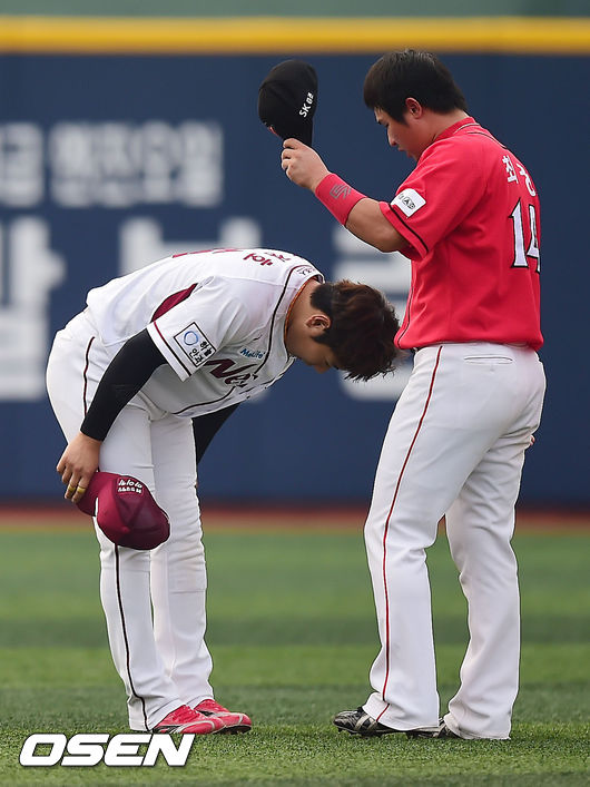 5일 오후 목동 야구장에서 열린 '2014 한국야쿠르트 세븐 프로야구' 넥센 히어로즈와 SK 와이번스의 경기,경기 전 강정호와 최정이 인사를 나누고 있다.