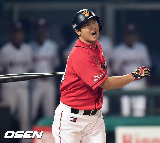 5일 오후 목동 야구장에서 열린 '2014 한국야쿠르트 세븐 프로야구' 넥센 히어로즈와 SK 와이번스의 경기, 5회초 2사 주자 만루 SK 최정이 넥센 선발 소사를 상대로 중견수 플라이 타구를 날리며 아쉬워하고 있다.