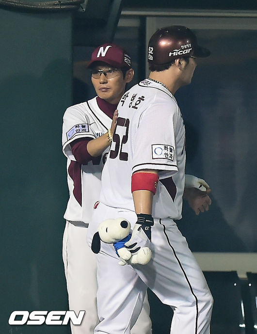 5회말 2사 주자 1,2루 넥센 박병호가 좌월 스리런 홈런을 날린 후 덕아웃에서 염경엽 감독과 하이파이브를 하고 있다. / rumi@osen.co.kr