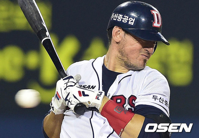 5일 오후 서울 잠실구장에서 열린 '2014 한국야쿠르트 세븐 프로야구' 두산 베어스와 KIA 타이거즈의 경기 6회말 1사 2루 칸투가 서재응의 몸쪽 공에 놀라고 있다.