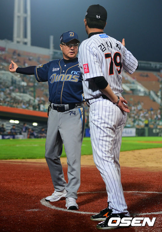 5일 오후 부산 사직구장에서 열린 '2014 한국야쿠르트 세븐 프로야구' 롯데 자이언츠와 NC 다이노스의 경기 5회초 홈 뒤 조명탑에 불이 나가자 경기가 일시 중단됐다. 김시진 감독과 김경문 감독이 이야기를 나누고 있다.