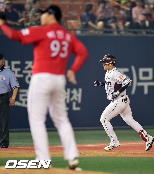 5일 오후 목동 야구장에서 열린 '2014 한국야쿠르트 세븐 프로야구' 넥센 히어로즈와 SK 와이번스의 경기, 6회말 1사 주자 없는 상황에서 넥센 문우람이 SK 박민호를 상대로 솔로홈런을 날린 후 그라운드를 돌고 있다.
