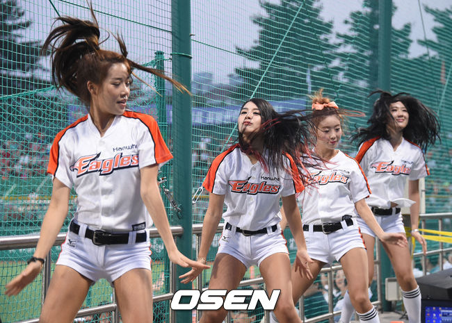 5일 오후 청주 야구장에서 열린 '2014 한국야쿠르트 세븐 프로야구' 한화 이글스와 삼성 라이온즈 경기, 한화 치어리더들이 흥겨운 음악에 맞춰 신나는 댄스를 선보이고 있다.
