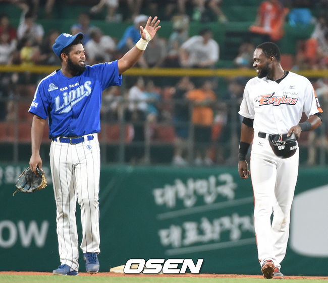 5일 오후 청주 야구장에서 열린 '2014 한국야쿠르트 세븐 프로야구' 한화 이글스와 삼성 라이온즈 경기, 6회말 공수교대때 삼성 나바로와 한화 피에가 인사를 나누고 있다.