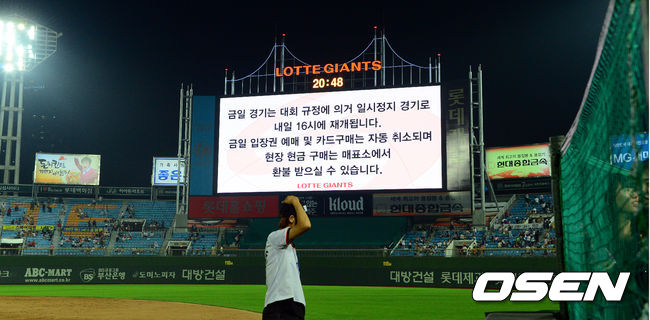 경기는 오후 7시 55분부터 중단됐다. 선수들은 곧바로 더그아웃으로 철수했고 수비를 하던 롯데 일부 외야수와 내야수는 그라운드에 앉아 망중한을 즐겼다. 1회 호흡곤란을 호소했던 정훈은 아예 누워서 잠시 쉬다가 더그아웃으로 복귀했다.