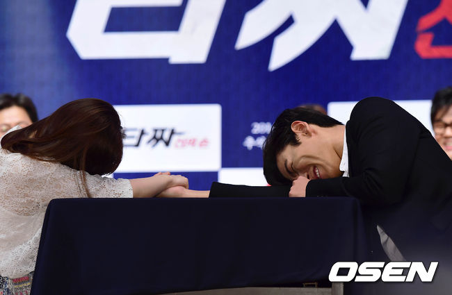 배우 최승현이 팬과 팔씨름을 하고 있다.