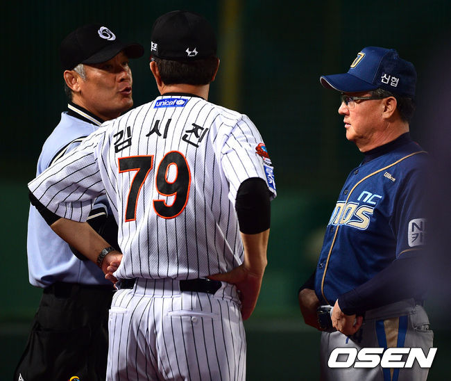 김경문 감독과 김시진 감독, 김병주 구심이 이야기를 나누고 있다. / soul1014@osen.co.kr