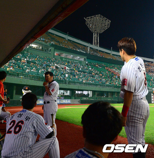 경기는 오후 7시 55분부터 중단됐다. 선수들은 곧바로 더그아웃으로 철수했고 수비를 하던 롯데 일부 외야수와 내야수는 그라운드에 앉아 망중한을 즐겼다. 1회 호흡곤란을 호소했던 정훈은 아예 누워서 잠시 쉬다가 더그아웃으로 복귀했다.