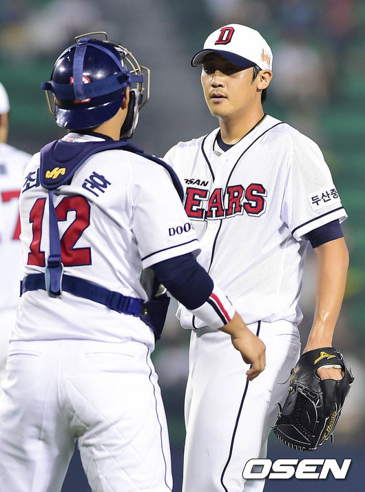 5일 오후 서울 잠실구장에서 열린 '2014 한국야쿠르트 세븐 프로야구' 두산 베어스와 KIA 타이거즈의 경기 종료 후 이용찬과 최재훈이 하이파이브를 하고 있다.