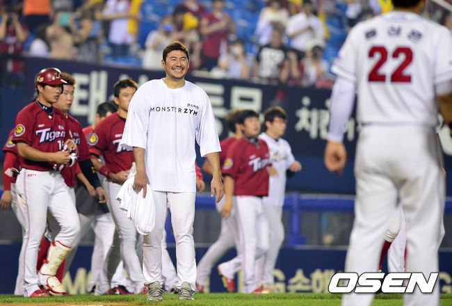 5일 오후 서울 잠실구장에서 열린 '2014 한국야쿠르트 세븐 프로야구' 두산 베어스와 KIA 타이거즈의 경기 종료 후 서재응이 두산 선수들을 향해 미소를 짓고 있다.