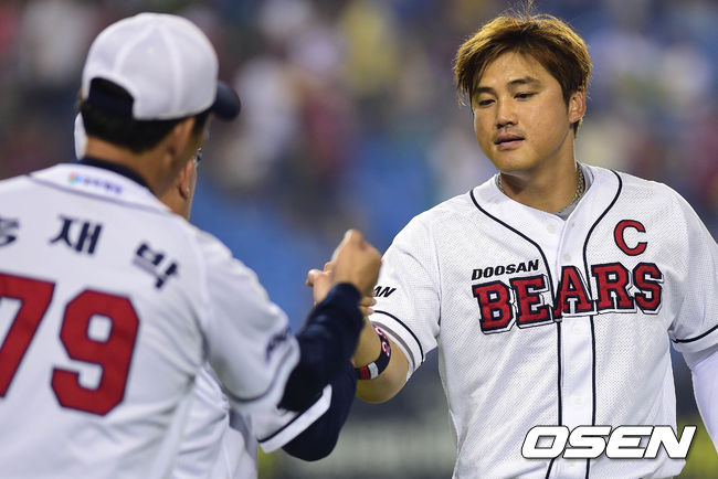 5일 오후 서울 잠실구장에서 열린 '2014 한국야쿠르트 세븐 프로야구' 두산 베어스와 KIA 타이거즈의 경기 종료 후 홍성흔이 송일수 감독과 하이파이브를 하고 있다.